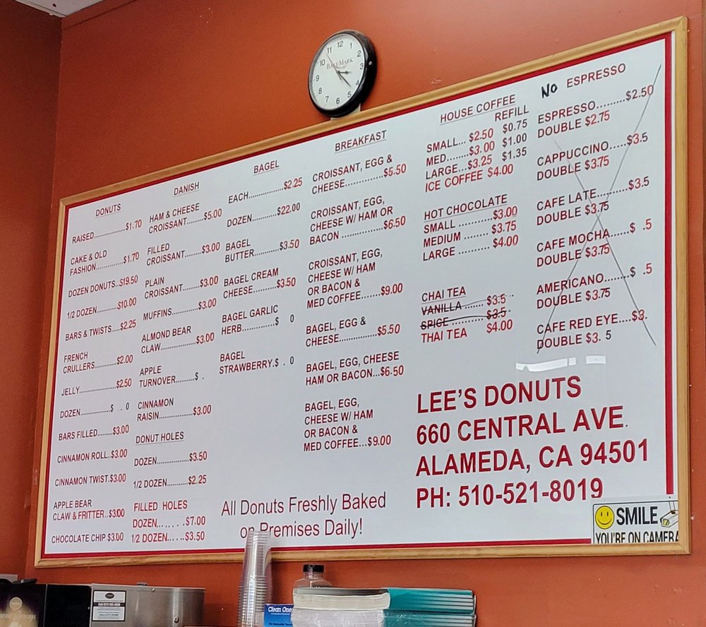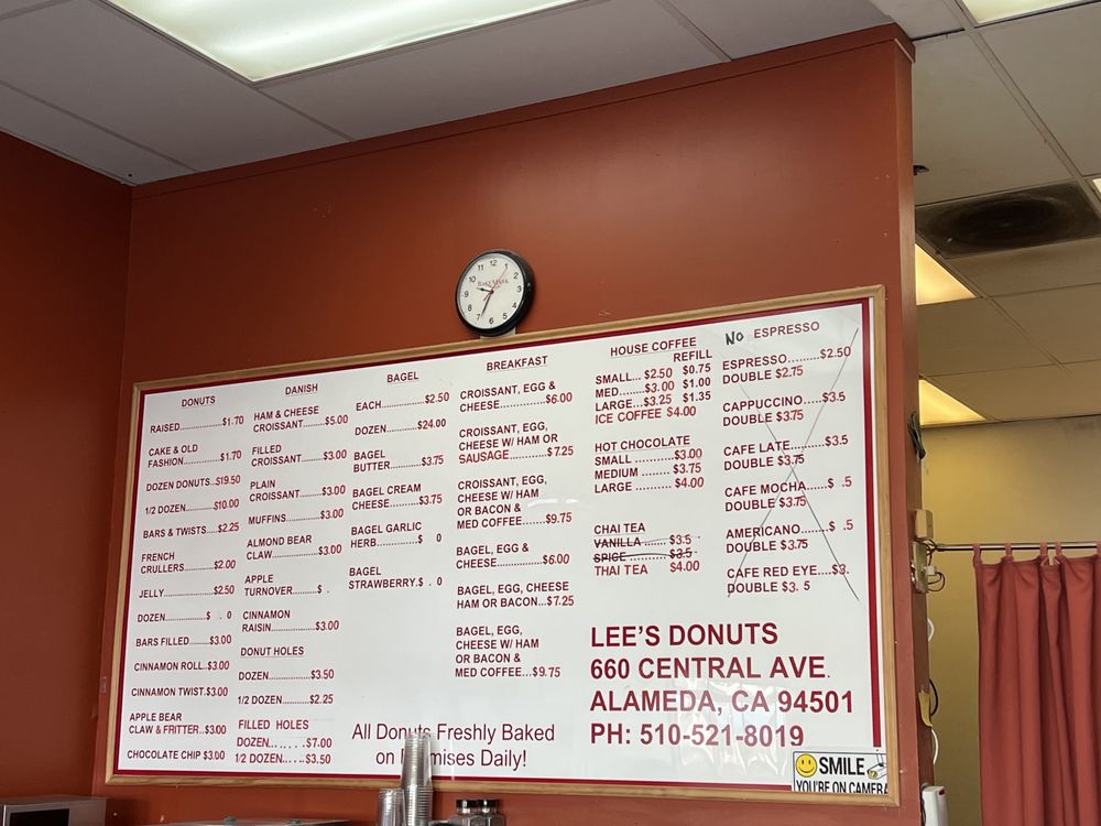 Located at 660 Central Ave # B, Alameda, CA 94501, this charming shop invites you in with the promise of delightful treats. From classic capabilities like the cinnamon roll and chocolate chip to unique offerings like mini jelly filled donuts, Lee's donuts provide something for every palate. You can also savor a fresh croissant or a hearty bagel with egg, cheese, and your choice of ham or bacon, perfectly paired with their range of espresso drinks, including cappuccinos and cafe lattes.